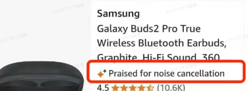 比如你搜索 “ 降噪耳机 ”,某个产品评分上方直接显示:“ 耳机因降噪性能而被广泛好评 ”,这对于正关心这一点的买家来说,转化概率显然会显著提高。
