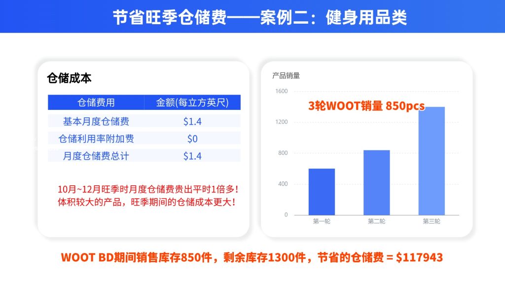 借助 Woot 推广渠道促销出部分库存后,剩余库存回仓处理,成功避开高峰期长期存放带来的费用风险,单次节省费用高达 117,943 美元。对这类大体积、销售节奏慢的品类,Woot 提报机制尤其值得考虑。