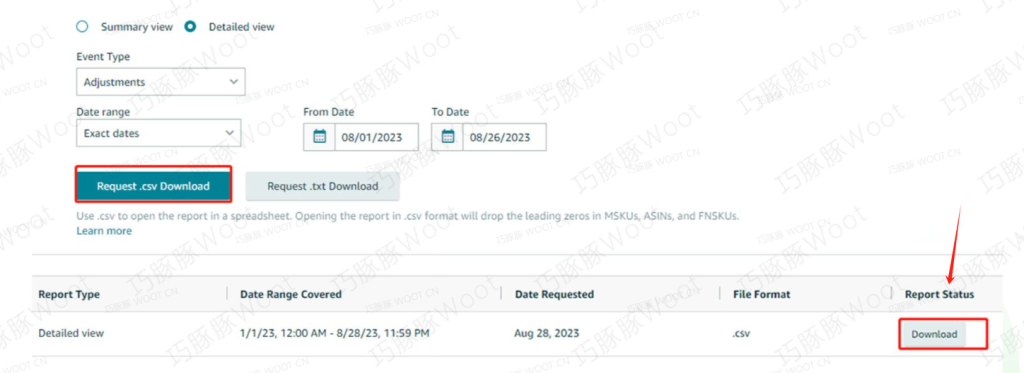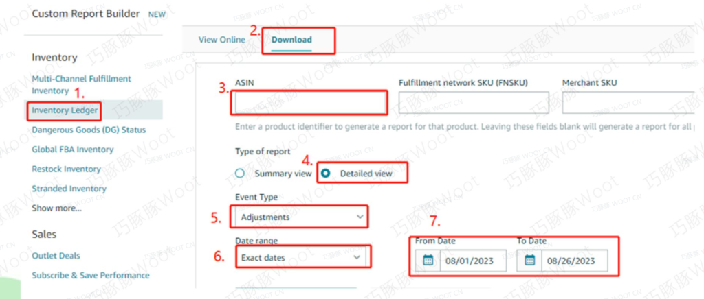 2)选择左侧 Inventory Ledger – Download 界面,输入要查询的子ASIN,按照下图的标注进行字段的选择,时间请按照 WOOT 退还库存的时间进行选择
