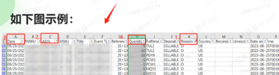 如下图示例:示例图中标出了关键列:A列为Date,C列为ASIN,H列为Quantity,K列为“O”