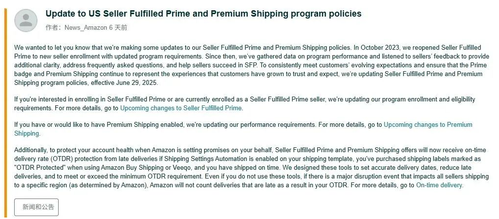 亚马逊美国站宣布自6月29日起对 “卖家自配送 Prime (SFP)” 政策进行重大调整。
