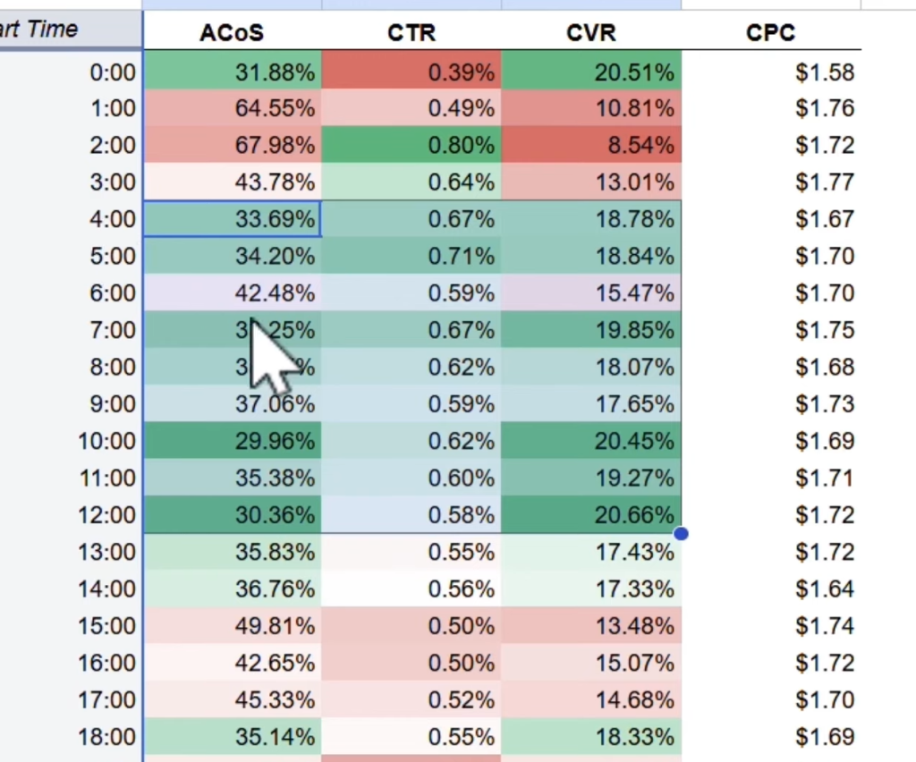 实际操作中,通常会根据过去 30 天的每小时数据,结合 ACOS、CVR、CPC 等关键指标,识别出高转化和低转化时段: