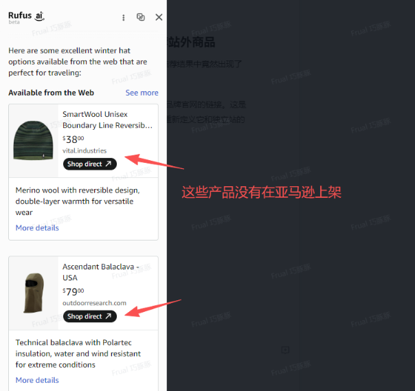 这些商品并未在亚马逊上架,但 Rufus 依然给出了推荐,并提供了跳转品牌官网的链接。这是亚马逊正在进行的一场战略测试。它释放了一个关键信号:亚马逊正在重新定义它和独立站的关系。