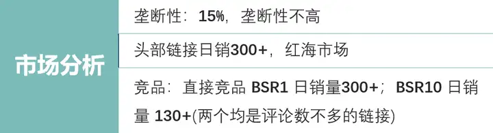 这个类目目前垄断性不高,大概在15%左右,还没有被头部完全吃死,还是有机会切进去的。