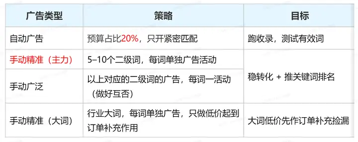 广告这边建议先收着点,不要一上来就放太多泛流量,容易把转化拉低。所以像SD、SB这类广告不投放,优先把精准流量跑顺。广告投放结构可参考下图: