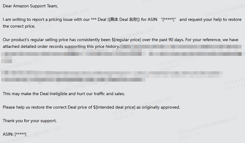 请您开 Case 联系Amazon,并提交过去 90天内成交的正常价格订单记录(需排除 BD、LD、会员专享折扣、Coupon 的订单)。要求Amazon在正常价格的基础上恢复正确的 Deal 折扣价格。