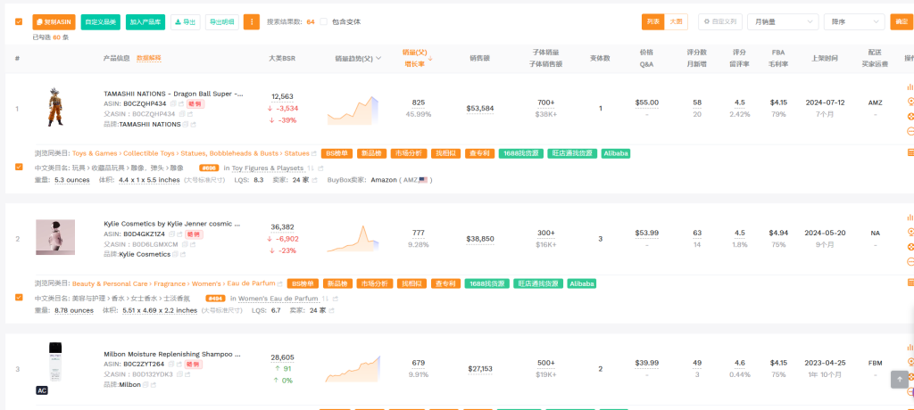 然后,将以上输出的限制条件在卖家精中进行筛选,就得出了以下产品: