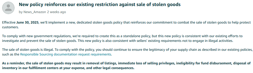 亚马逊近日发布公告宣布,自 2025年6月30日 起将实施专门针对赃物商品的新政策,加强打击赃物销售行为,以保障买家权益。该政策从原有“非法活动”政策中独立出来,明确规定销售被盗商品将面临商品强制下架、账号封禁、冻结货款等严厉处罚。