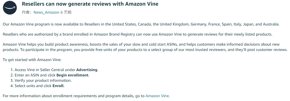 亚马逊近日宣布已向品牌授权经销商开放 Vine 评价计划,除了品牌所有者外,获得品牌方授权的经销商也能独立为新品提交 Vine 计划,通过向平台精选评论员免费提供商品,快速积累首批真实用户评论。