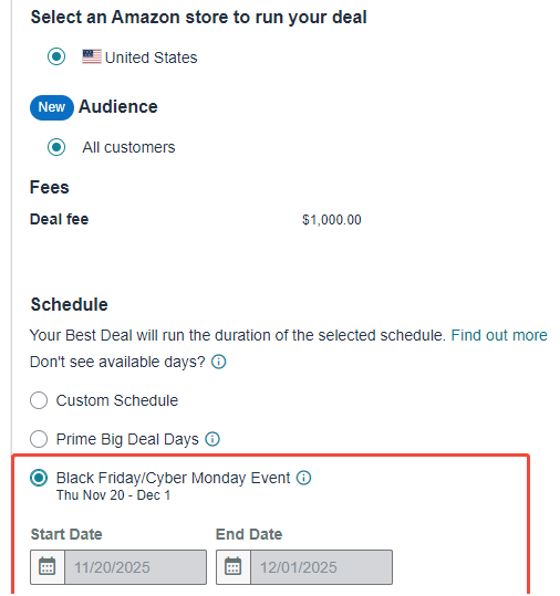 2025年亚马逊黑色星期五/网络星期一大促活动档期定于 11月20日 至 12月1日。卖家现已可在后台提交促销申请,提前布局年终旺季。