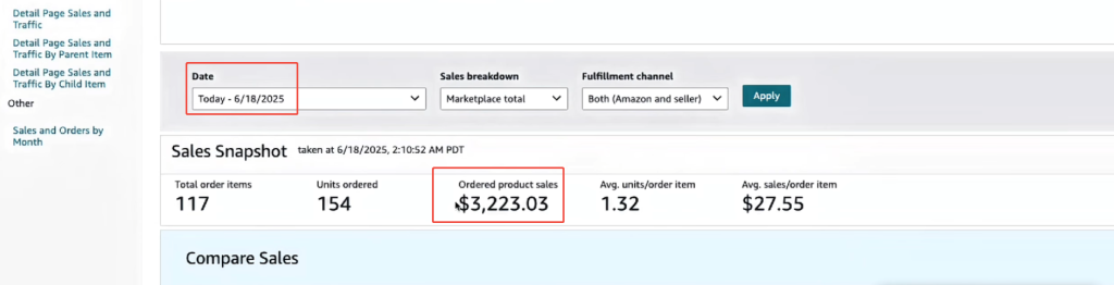 进入亚马逊卖家中心的 业务报告 (Business Reports) -> 销售控制面板 (Sales Dashboard),查看当天的 总销售额 (Ordered product sales)