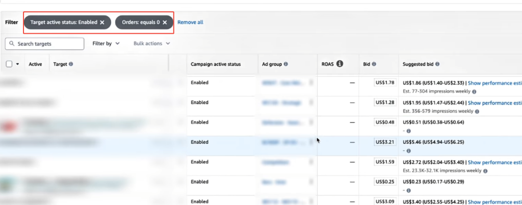 进入“Targeting (投放)” 标签页,用同样的方法筛选出过去 30 天内,有点击、有花费但 订单数为0 的关键词。