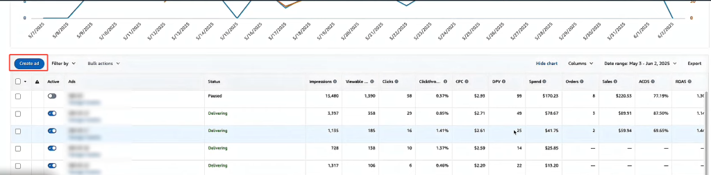 卖家可以进入现有的 Sponsored Brand Video 广告组,点击已创建广告后,选择“创建广告”,在相同关键词下添加新的视频素材,无需新建广告组即可完成 A/B 测试结构。这能帮助卖家在素材有限、预算受控的情况下,最大化测试效率。