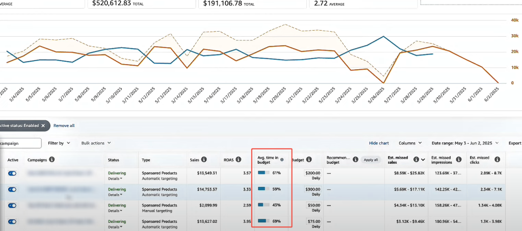 Budget Tab 是广告后台中一个关键但常被忽略的功能,从新增的 ”Average Time In Budget“ 列,卖家可以清晰地看到广告在过去 30 天中实际运行的时间占比。如果某一广告只有 60% 的时间在预算范围内,意味着该广告在约 40% 的时间内因预算不足而未能正常投放。预算不足带来的中断现象,还可能使系统降低该广告的权重,影响其后续投放效率。