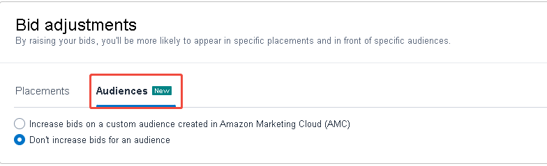 建议新建广告系列单独测试,以免影响原有关键词结构。对于尚未使用 Amazon Marketing Cloud 的卖家,推荐优先使用受众竞价调整功能,这些系统构建的受众竞价功能定位简单、设置直接,具备良好的可转化性,是当前阶段相对稳妥的测试方法。