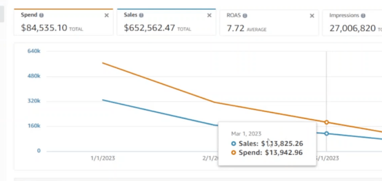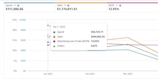 让我们以一个案例为例。我们在一家品牌账户中介入时间是在一月份,当时一切看起来都很不错,销售额达到了444,000美元,ACoS(广告支出与销售额之比)为12%。