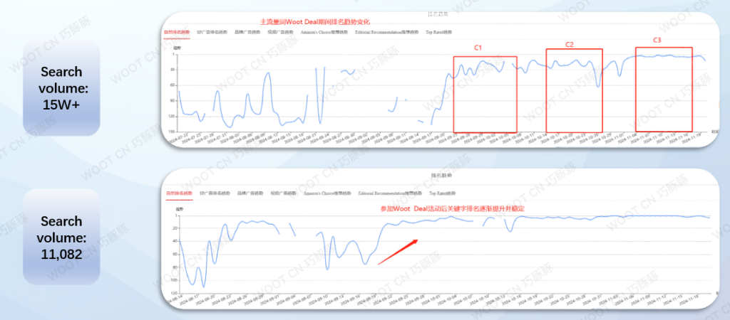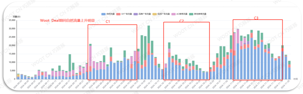 ▲自然流量增长明显:通过多轮BD活动提升销量和排名,有效带动了产品自然流量增长,证明了Woot Deal 活动的积极效果。