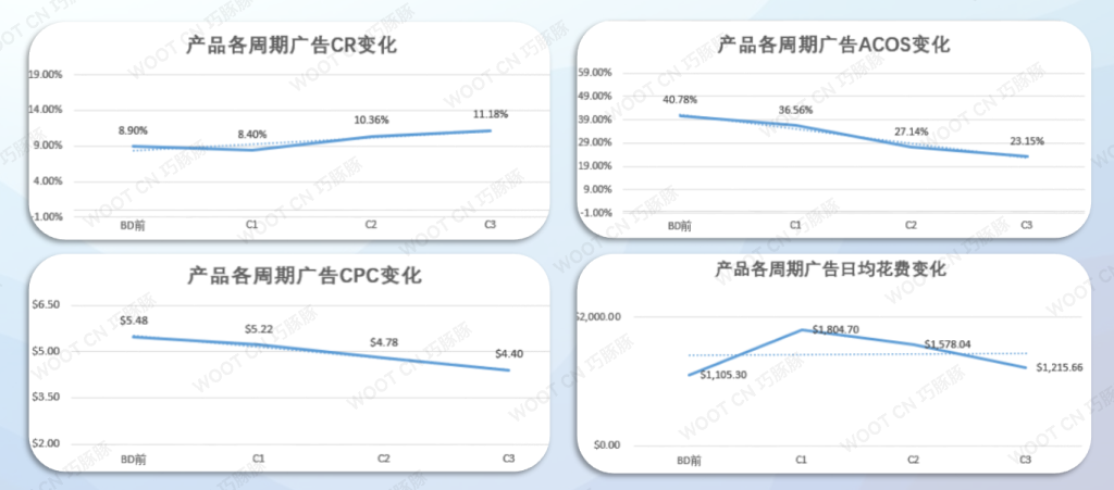 经过三轮Woot Deal活动, 转化率逐轮提高,较BD前提升20%,CPC及ACO逐步下降,降低广告成本的同时,提高广告效率
