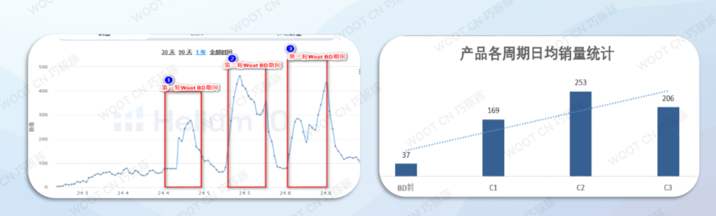 增幅明显:日均销量从BD前的30+个增长至200+个,呈现出510%的巨大增幅