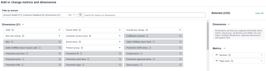 - 数据指标不同匹配不同的数据维度,比如指标 Session, Page Views 只可以查询ASIN 维度的,SKU 维度不可查看