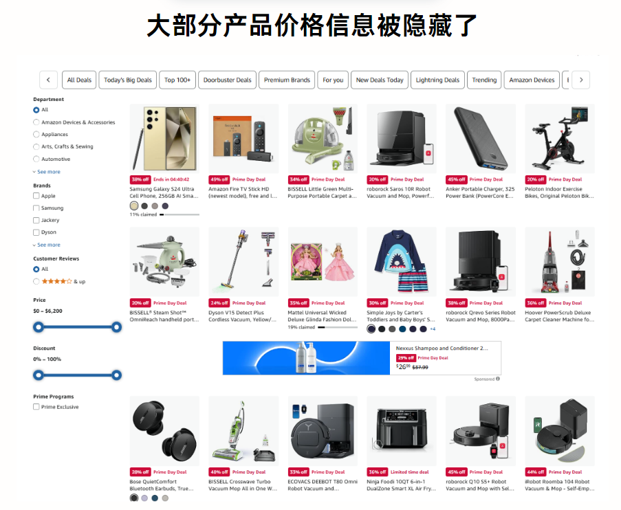 今年会员日巧豚豚注意到一个细节变化——主会场页面大部分参与大促且带有“Prime Day Deal”标签的产品,价格信息被隐藏了,这和往年大促满屏低价的画风明显不同。