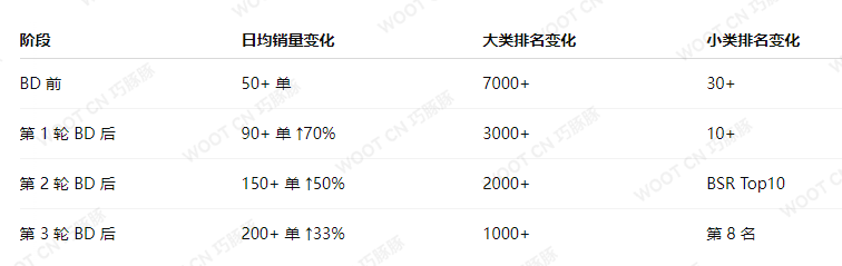 一次促销很难彻底激活老链接。通过连续三轮 WOOT BD,每一轮都在销量、排名、广告表现上进一步突破,加速产品从沉寂期到爆发期的转变。
