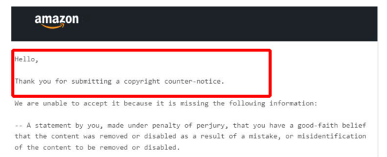 - 如果投诉涉及 DMCA(数字千年版权法)问题,您可以向侵权投诉人发送 DMCA 通知,并向亚马逊发送验证该投诉的副本。