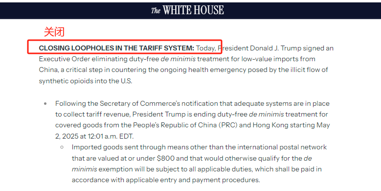 美国总统特朗普签署了一项重要行政命令,宣布将于2025年5月2日起正式终止“de minimis”(小额豁免)贸易漏洞政策。