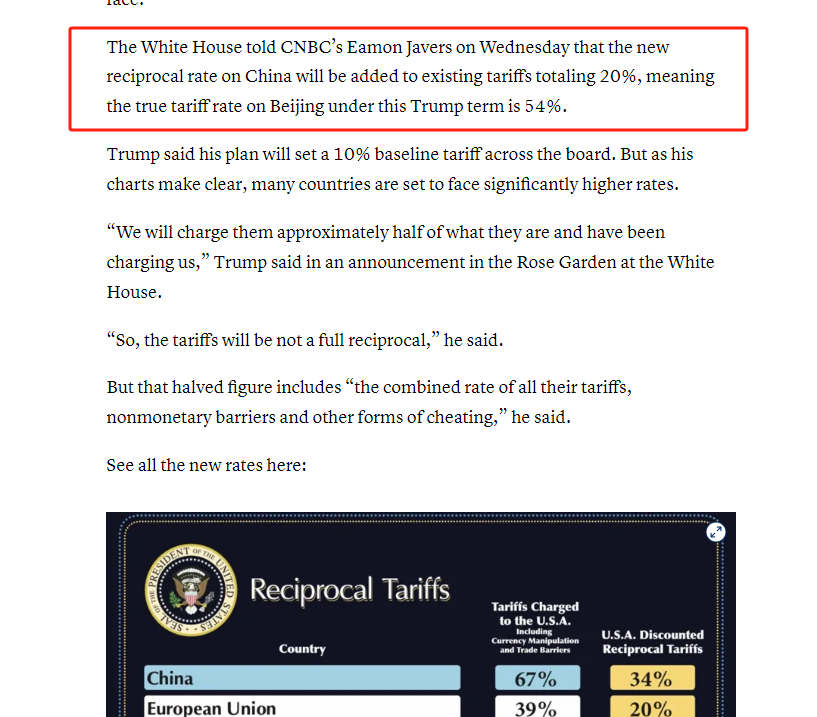 其中,中国最高被加到54%,现在这个“互惠税”是额外加的,中国本来就已经被加过关税了,所以中国加起来是34% + 原有20% = 54%