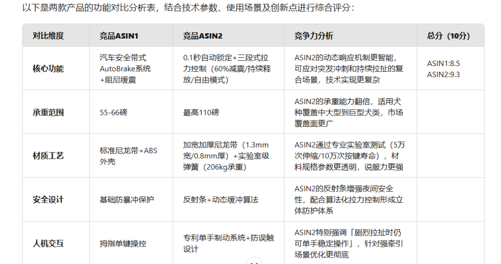 (2)DeepSeek 会自动生成竞品功能对比表,分析你的产品竞争力。