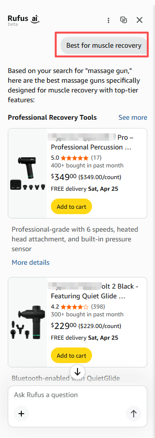 Prompts 可能出现在 shopping results 和 product detail pages,点击后可能进入 Rufus 对话,也可能直接在页面响应。