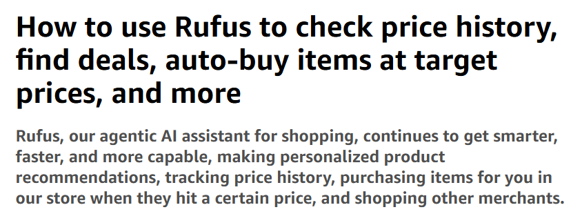 近期亚马逊官方发布公告,宣布 Rufus 正式向代理式 AI(Agentic AI)升级。Rufus 不再只是陪买家聊天、回答问题,它能够在一定条件下,自动帮买家购买产品。