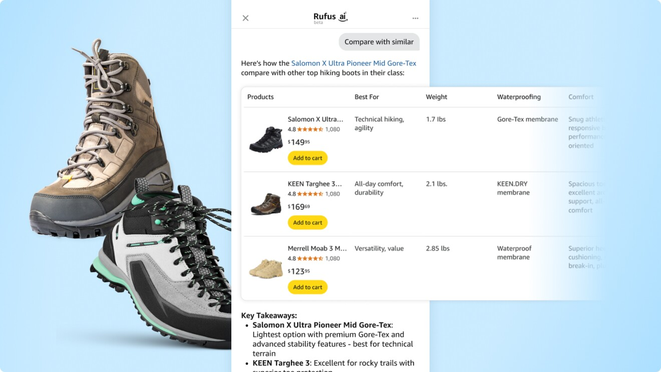 根据买家的提问,如果 Rufus 在站内没有找到合适的产品,就会推荐站外其它线上商家的产品,并提供 Buy For Me 按钮,买家不用跳转到其他商店,在 Rufus 里就可以完成购买。