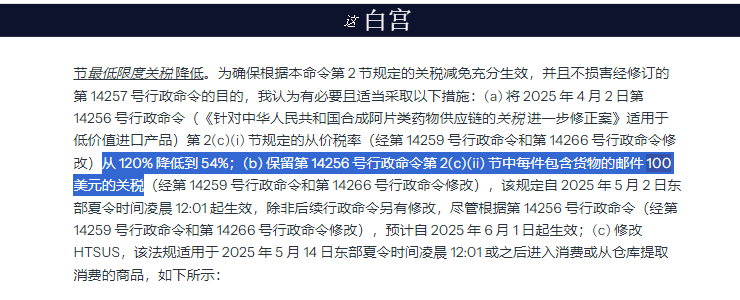 - 5月14日起,进入新政策阶段:120% 从价税 下调为 54%,每件固定税额计划调涨至200美元 现维持100美元,不再上涨。