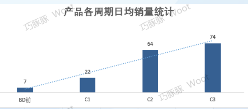 WOOT三轮BD连打策略,逐步释放系统信任,数据结果显示,产品从BD前的7单/天提升至第三轮后的74单/天,销售爬升曲线呈现稳定阶梯式递增,标志着ASIN链接已完成系统重识别,回归正常权重轨道,为后续自然流量突破和广告投放提供有力支撑。