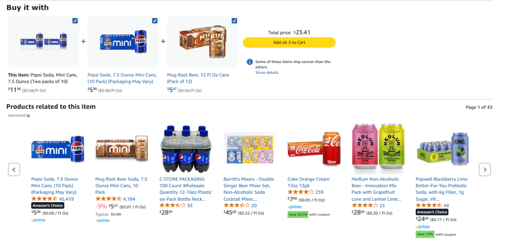 Pepsi 的品牌防守比 Coca-Cola 稍强,搜索页和 PDP 区域都有部分自家广告,具备一定防守意识。但整体覆盖不够,详情页底部仍有空位被竞品插入。这类“有布防但不全面”的策略,在竞争激烈的类目下仍有流量流失风险,虽具参考价值,但仍有提升空间