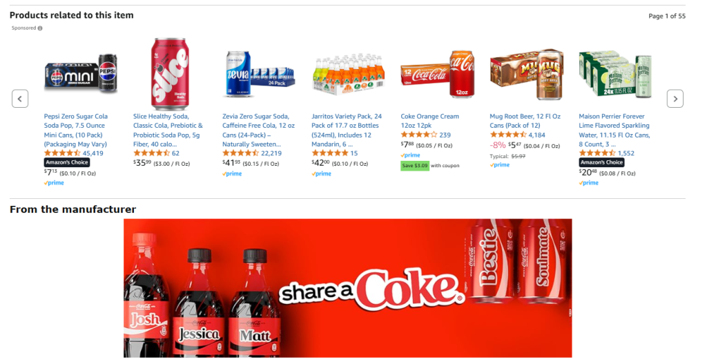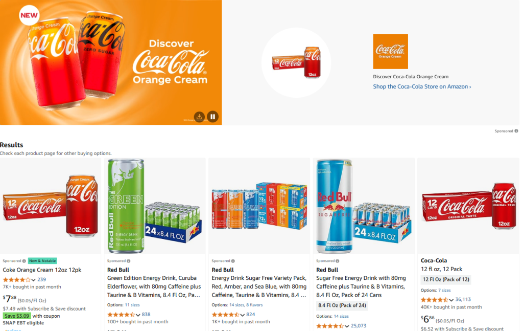 即使是像 Coca-Cola 这样的全球品牌,在亚马逊上也并非没有短板。搜索结果页的广告铺得还算完整,品牌防守意识尚可