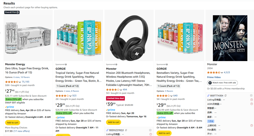 Monster 在品牌防守上几乎处于空白状态,无论搜索页还是详情页,自家广告几乎看不到,尤其是 PDP 底部几乎被竞品完全占据。缺乏防守让其流量流失风险极高,用户即便有初步意向,滑到底部看到竞品后,转化极易被截走