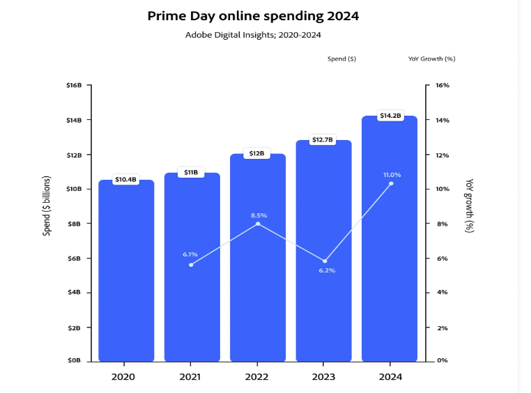 根据 Adobe Analytics 数据,2024 年 Prime Day 全平台销售额约为 142 亿美元,同比增长 10.5%。