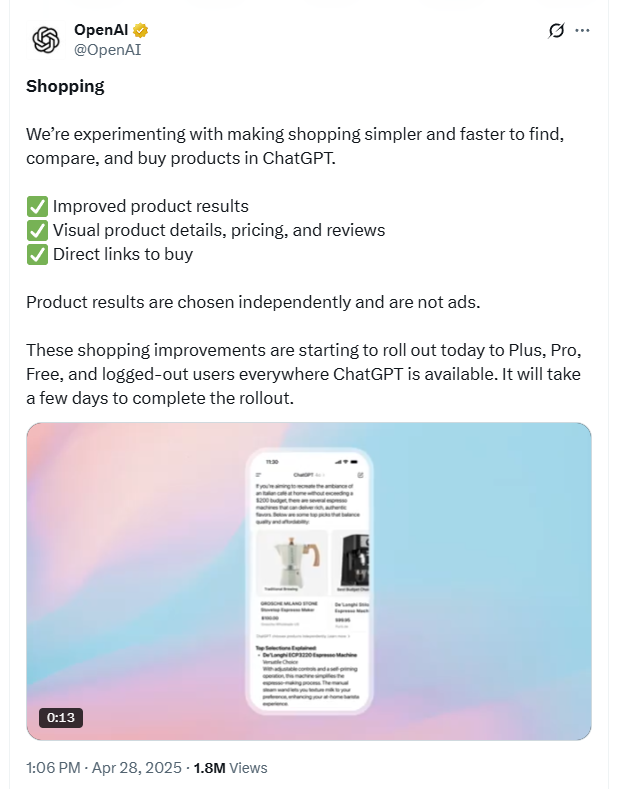 4 月下旬,OpenAI 推出 ChatGPT 的购物推荐功能,并全面向所有用户开放 。